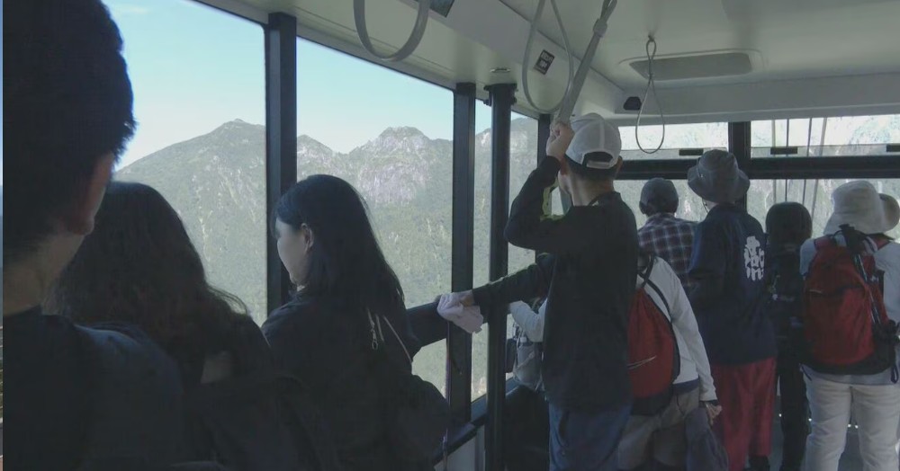 O teleférico Shinhotaka em Oku-Hida Onsenkyo, onde uma gôndola de dois andares conecta a montanha em uma extensão total de aproximadamente 3,2 quilômetros, estava lotado de visitantes no primeiro dia do fim de semana prolongado.
