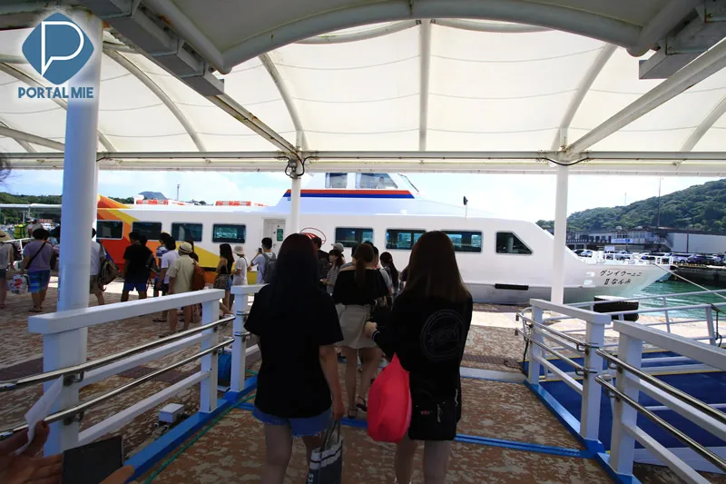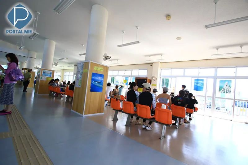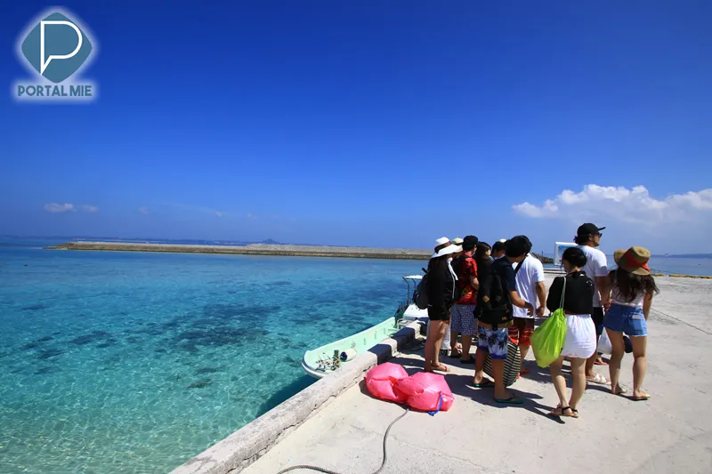 a imagem alguns visitantes aguardam pelo barco para voltar à ilha principal de Okinawa (PM)