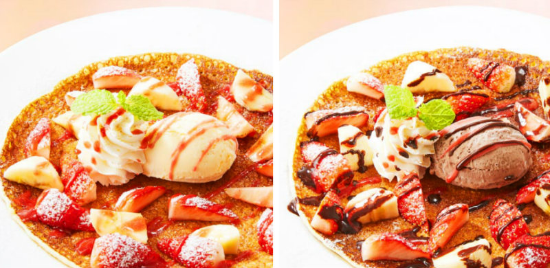Há 2 tipos de galette, ambos com o aroma da manteiga, cobertos com bananas e morangos frescos e uma bola de sorvete. Esse pode ser de baunilha ou de chocolate. Na cobertura uma rica calda com a fruta vermelha. Cada um tem 428kCal e custa 646 ienes com imposto.
